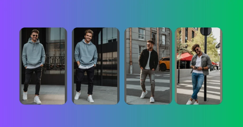 Hey there, fashion fans! Check out this guy – he’s rocking the ultimate casual cool look. It’s all about comfort and style, proving you don’t need a tuxedo to look amazing. His light blue hoodie is super chill, perfect for hanging out with friends or heading to class. Those dark jeans are classic, and the way he’s cuffed them at the ankles shows he’s got a bit of style savvy. Those crisp white sneakers? They’re the cherry on top – comfy and stylish. Think of it as your go-to outfit when you want to look good without trying too hard. It’s basically the epitome of effortless cool!