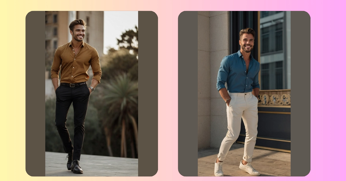 This guy’s outfit is proof that being a perfect gentleman doesn’t mean wearing a stuffy tuxedo! He’s rocking a casual-cool look that’s totally achievable. Think comfy-but-sharp cream pants, a breezy blue shirt—perfect for those warm days—and some clean white sneakers. It’s like the best parts of a dressy outfit and your favorite weekend chill vibe all rolled into one. No need for fancy pocket squares or complicated ties; this is all about effortless style that still screams “I’ve got my act together!”