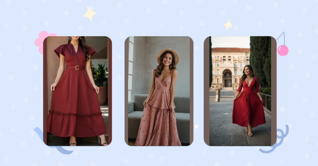 That stunning maroon maxi dress? It’s like stepping out of a fairytale, but way more comfortable than glass slippers! The off-the-shoulder style adds a touch of modern sass to a classic, elegant look. Imagine yourself twirling in this beauty – maybe at a fancy party, a summer wedding, or even just a super stylish picnic in the park. It’s the kind of dress that screams “confidence” without even trying!