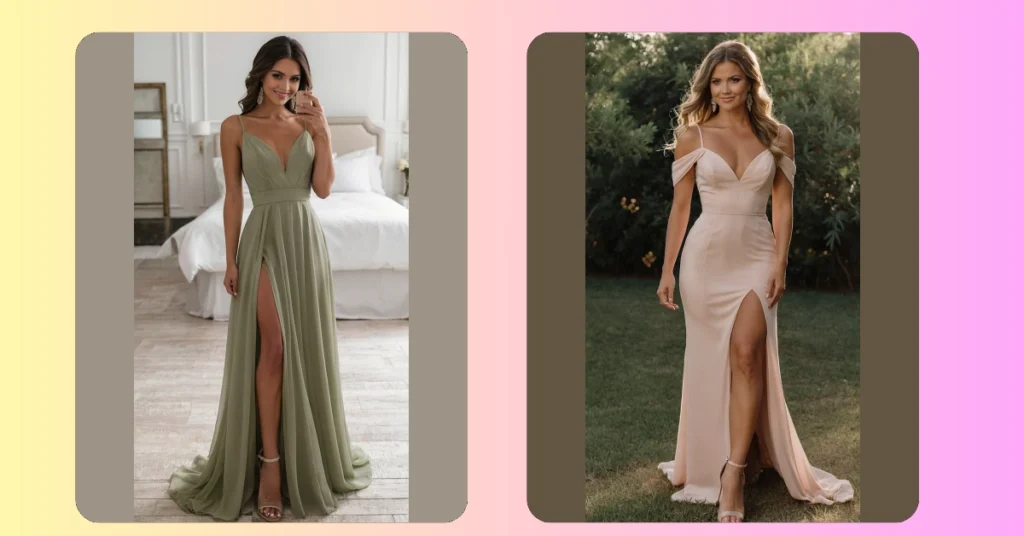 This bridesmaid dress is seriously next-level. Imagine yourself, looking like a total goddess in this flowy, olive-green gown. It’s got that perfect v-neck to show off your amazing collarbone, and a thigh-high slit that’s just daring enough without being too much. Forget hiding in the background—you’ll be stealing the spotlight (but in a supportive, bridesmaid-y kind of way, of course!). Plus, the color? It’s like the sophisticated cousin of army green. It’s the kind of dress that will make even the grumpiest bridesmaid feel fabulous.