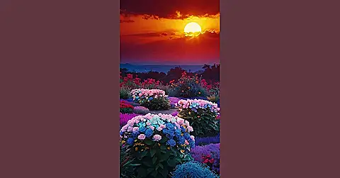 The image shows a beautiful garden bursting with color, a sight that would make even the grumpiest gardener smile. The flowers are in full bloom, a rainbow of pinks, blues, and purples. But what really makes this picture special is the sunset. The sun is setting behind a row of mountains, painting the sky in vibrant shades of orange and red. It’s like a giant, fiery masterpiece painted across the heavens!