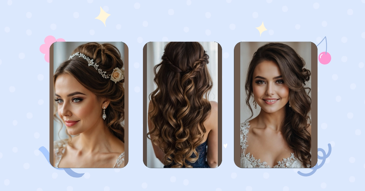 The ever-so-popular half up half down style deserves a standing ovation, don’t you think? It combines the charm of a complete updo while letting your hair breathe, flow, and shine. Perfect for keeping those pesky strands away from your face as you laugh with family and friends! The best part? You can let your bridesmaids rock their own versions, creating a unified but unique look for your crew.