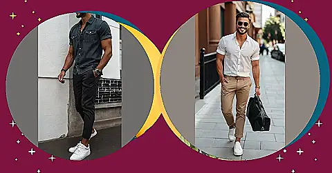 This guy definitely knows how to rock a casual, stylish look! A crisp white shirt, some khaki pants that are just begging to be rolled up, and a killer pair of white sneakers – talk about a fashion statement! He’s looking so cool and confident, it’s like he just walked out of a magazine!