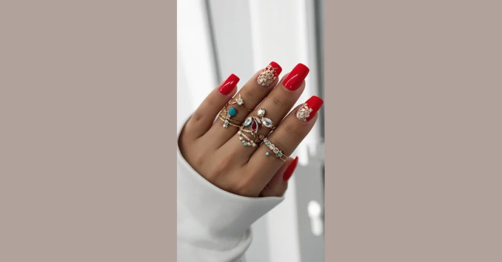 These nails are seriously festive! Just look at those gorgeous crimson acrylics, perfect for December and all things Christmas. They’re like a little party on your fingertips – sophisticated and fun at the same time. The gold accents are super chic, and that red ring is the cherry on top (pun intended!). Imagine showing these off at your family’s Christmas dinner – you’ll be the most stylish person there!