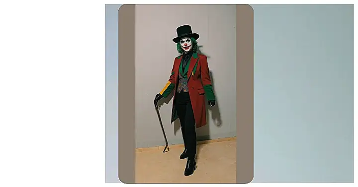 This image shows a super cool Joker costume, perfect for Halloween or a cosplay event. The outfit is totally awesome, and it totally screams “Joker” with the red and black colours, the jester’s hat, and that wild makeup. The big white collar and fluffy pom-poms are the cherry on top of this hilarious look. You can’t help but smile when you see someone rocking this Joker costume, especially the mischievous grin on their face.