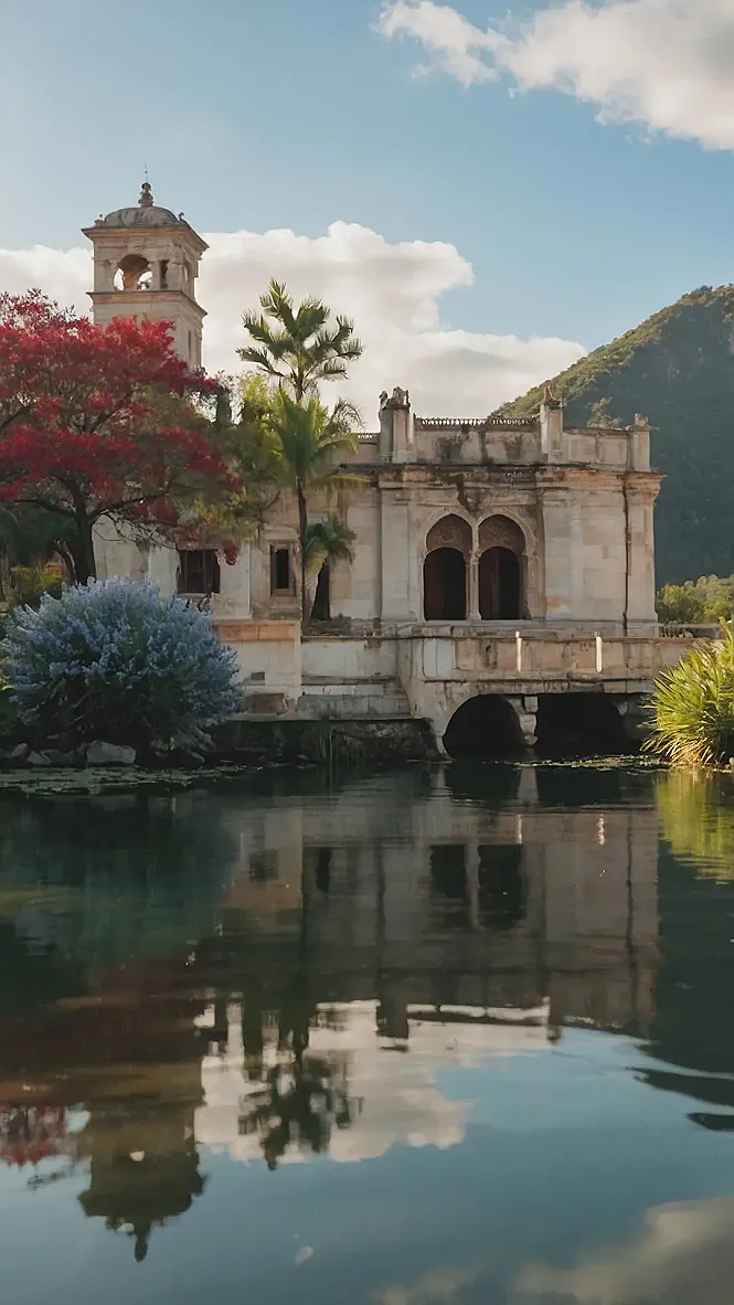 Imagine stepping into a fairytale! This picture is like something straight out of a storybook, with a beautiful, old building that looks like it was built by a magical prince. The building has a cool tower, a big porch with arched windows, and it’s even sitting on a bridge over a peaceful lake. It’s like a hidden castle that’s just waiting to be explored.