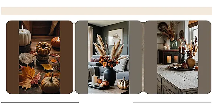 This picture is like a cozy fall dream come true! There are cute pumpkins, candles, and leaves in all the warm colors of fall. It’s all really pretty, but it’s not over-the-top like some fall decor. Think of it like this: it’s like wearing a comfy sweater and jeans instead of a full-blown pumpkin costume!