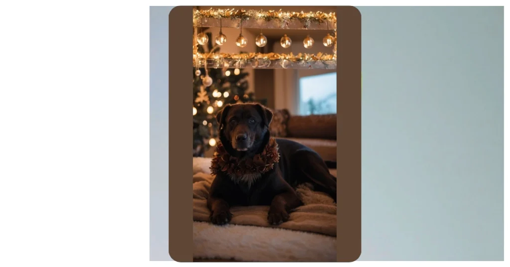 This adorable pup is all decked out for the holidays! They’re wearing a festive wreath around their neck, like a tiny, furry Santa Claus. It looks like they’ve found the perfect spot to relax and enjoy the cozy Christmas atmosphere. With all those twinkling lights and the comfy blanket, this doggo is ready for some serious holiday chill time.