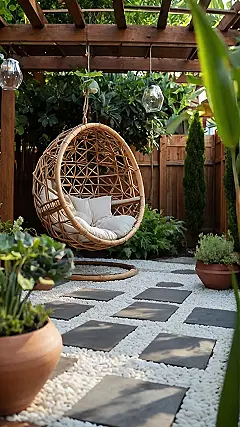 Imagine coming home after a long day of school, ditching your backpack, and collapsing into *that* chair. Seriously, it’s not just a chair, it’s a hanging pod of pure relaxation! This garden is proof that creative garden design doesn’t have to be complicated or expensive. With some clever landscaping, stepping stones, and a statement piece like that epic swing, you can transform any backyard into a chill zone worthy of a magazine cover (or at least a killer Instagram post).