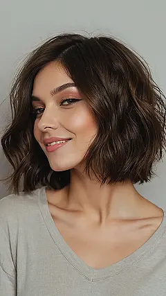 This picture shows a seriously chic shoulder-length bob! It’s got that perfect amount of wavy texture – not too messy, not too perfect, just right for hanging out with friends or acing that big history test. Imagine yourself rocking this look: effortlessly cool, and ready to take on the world, one perfectly placed curl at a time. Who needs a tiara when you have a hairstyle this amazing?