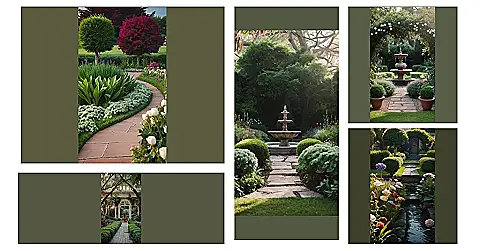 This garden is like something out of a fairytale! It’s got everything a dreamy garden needs: lush greenery, colorful flowers, and a path that whispers secrets to those who walk it. Imagine being a little gnome, peeking out from behind a rosebush, and seeing a stone path winding its way toward a magical fountain. You could almost hear the tinkling music of fairies as they flit about, spreading their magic through the air. It’s the kind of place where you could wander for hours, lost in the beauty of the world around you.