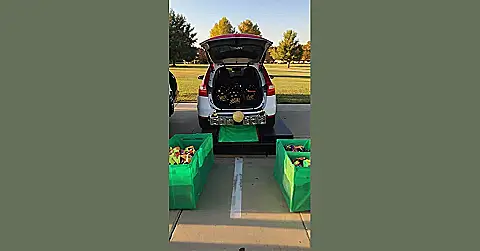 This car is ready to be a Trunk or Treat champion! Just look at all those spooky decorations! There’s a skull hanging from the ceiling, and a cool glow-in-the-dark skeleton hanging on the back window. It looks like they’ve got a whole trunk full of goodies ready to go! Maybe they even have some spooky glow sticks for all the kids! Trunk or Treating is a blast – get your car ready, dress up in your spookiest costume, and get ready for some Halloween fun!