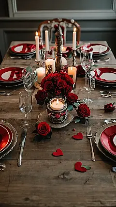 Forget awkward Valentine’s Day dinners! This table setting is seriously dreamy. Look at all those roses – enough to make even the grumpiest Cupid swoon! The soft candlelight, the fancy gold accents, and the little heart-shaped confetti sprinkled everywhere… it’s like a fairytale come true. Even if you’re not a romantic, you’ve got to admit it’s pretty epic for a Valentine’s table decor. It’s the perfect blend of classy and fun, ready to make your Valentine’s Day dinner extra special, or just a regular Tuesday night feel amazing!