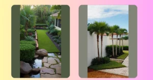 This backyard is like stepping into a tropical dream! With lush green grass, towering palm trees, and even a cozy patio area, this home garden is perfect for relaxing and enjoying the sunshine. Imagine sipping iced tea under the shade of those beautiful palm trees while watching the clouds drift by. It’s like a mini-vacation right in your own backyard!