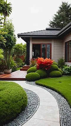 This backyard is like stepping into a magazine! It’s got all the things that make a home garden super cool, like a fancy stone path that winds around perfectly manicured shrubs. The bright red flower popping out in the middle is like the star of the show, saying “Hey, look at me!” And the whole place looks so peaceful and inviting, it’s like you could just kick back with a good book and forget about all your worries.