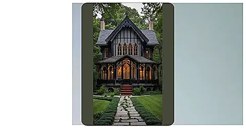 This house looks like something straight out of a fairytale! It’s got all the classic features of Gothic architecture: pointy arches, tall windows, and even a bit of a spooky vibe. It’s like a charming, slightly creepy gingerbread house that’s perfect for a spooky Halloween party.