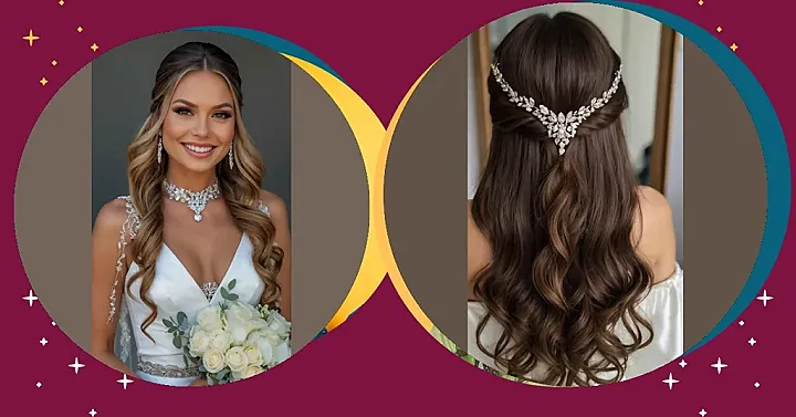 This hairstyle is like a fairytale come true! Half up, half down, with those luscious, wavy locks cascading down – it’s totally bridal perfection. Imagine walking down the aisle, feeling like a princess with this gorgeous style and a sparkly hairpiece that looks like it’s straight out of a Disney movie. It’s the perfect blend of elegant and fun, and you’ll be turning heads all night long!