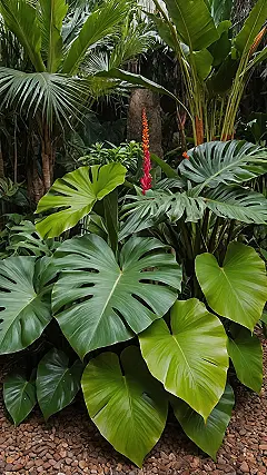 Walking into a garden stuffed with tropical plants is like accidentally crashing a really wild, colorful party thrown by Mother Nature herself. Forget polite little flowers; these guys are showing up in neon reds and blinding oranges, probably sipping on rainwater cocktails and showing off their massive, shiny leaves. They’re all huddled around the cool waterfall pool, looking like they just finished a competitive game of ‘who can grow the spikiest’. You can almost hear the leaves rustling like they’re gossiping about how much better the weather is here than anywhere else.