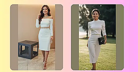 This outfit is like a blank canvas waiting for a masterpiece! A simple white dress with a touch of sparkle, it’s begging to be accessorized with colorful jewelry or a bright statement purse. Think of it as your own personal runway – get creative and let your personality shine! It’s like a blank canvas for your style – add your own flair and turn heads!