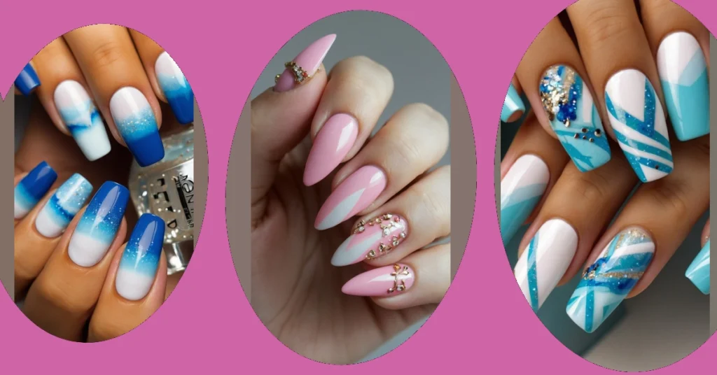 These nails are like a mini vacation for your hands! Imagine rocking these cute nail designs, and suddenly you’re transported to a tropical beach where the waves are crashing and the sky is the bluest blue you’ve ever seen. The white fading into that gorgeous blue is seriously next-level artistry, perfect for when you want to add a touch of beachy elegance to your everyday look, or for the summer.