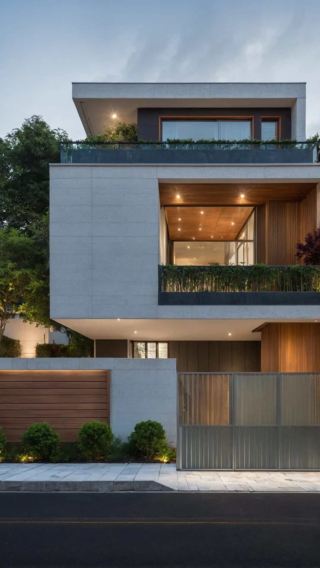 This house is seriously showing off its front elevation design, like it just woke up, put on its best outfit, and posed for the ultimate street view selfie. Look at those sleek lines, the mix of cool wood and modern bits, and balconies that probably have views way better than my bedroom window. It’s got fancy lighting too, making it look extra dramatic as the sun goes down. Plus, it has a special spot for what look like speedy cars, just to complete the “I’m awesome” vibe from the curb.