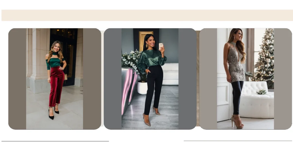 Forget reindeer sweaters – this holiday party outfit is all about festive chic. Picture this: you’re rocking a gorgeous emerald green top that’s so smooth it practically glows, paired with seriously stylish crimson velvet pants. It’s like Christmas and a Hollywood premiere had a baby, and that baby is ridiculously fabulous. The best part? You’ll be dancing the night away in comfort, without feeling like you’re wearing a Christmas tree!