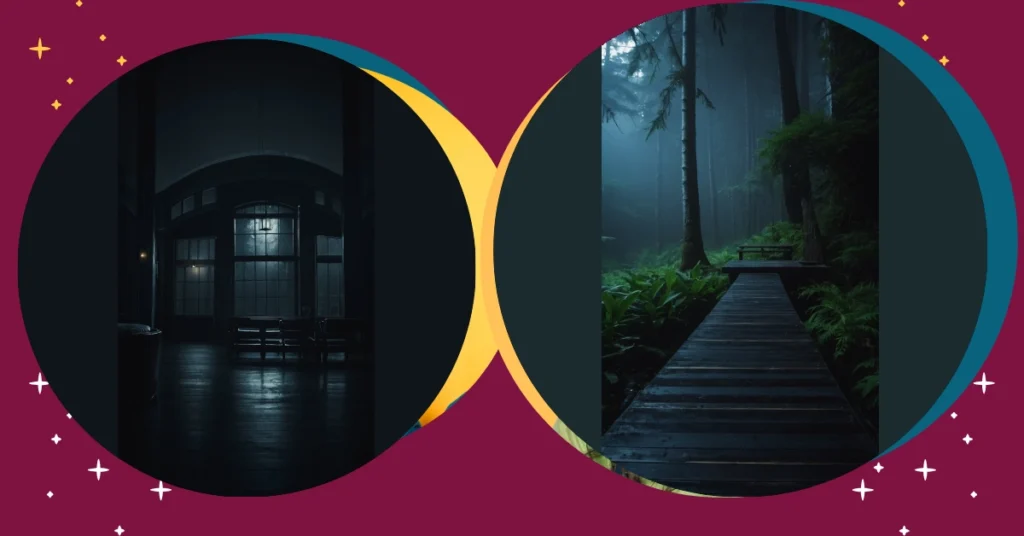 This image is like a scene straight out of a spooky but chill mystery novel! Imagine it: you’re curled up with a hot chocolate, the rain pattering outside, and this picture is your phone wallpaper. The dark, relaxing vibes are totally on point – it’s like a secret hideout in a haunted house, but instead of being scared, you’re just cozy and intrigued. The moon shining through the windows is giving off major “I’m watching over you” vibes, and those mysterious benches are just begging for a ghostly tale to unfold.