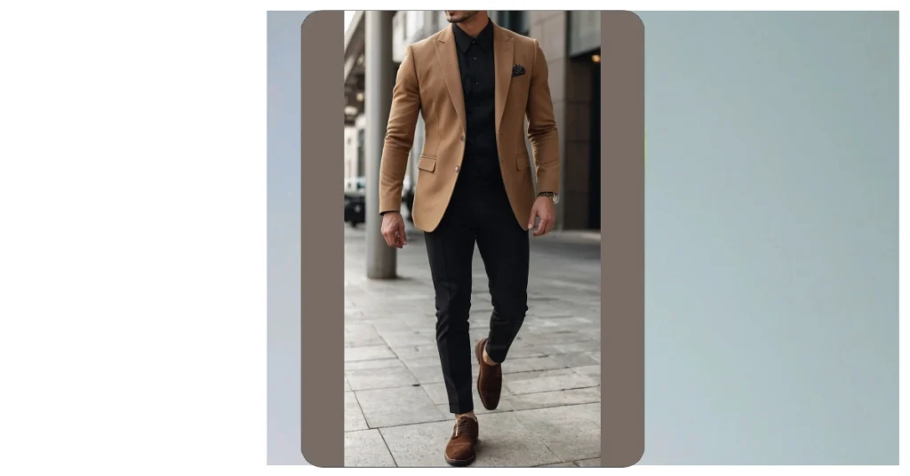 Want to look like you own the place, even if you’re just borrowing the sidewalk? This outfit’s a winner! It’s like the grown-up version of wearing your favorite superhero tee, only instead of saving the world, you’re just saving yourself from a fashion disaster. The black shirt and pants are simple and cool, and the camel blazer adds just the right amount of ‘I’m in charge’ without looking like you’re about to fire someone.