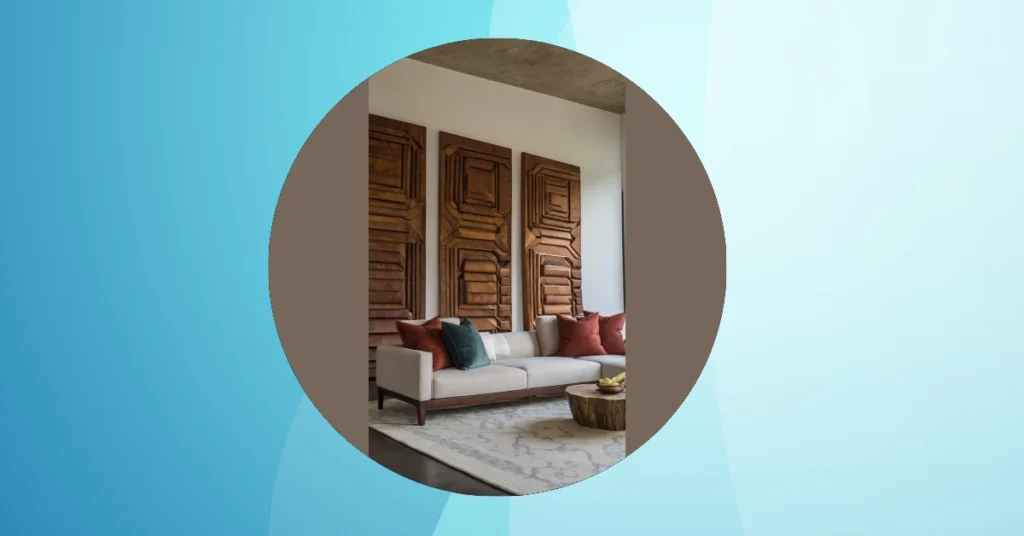 This living room is seriously stylish! Imagine chilling out on that comfy-looking sofa, surrounded by these amazing, super-cool wooden panels. They look like giant, artistic puzzles, all brown and geometric – it’s like modern art meets a really cool tree house. The whole vibe is super relaxed, all natural materials and earthy tones. It’s the perfect spot to binge-watch your favorite show or just hang out with friends, right?