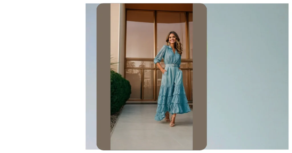 This isn’t your grandma’s middle-aged women’s fashion! Look at this gorgeous dress – it’s like a breezy summer dream in light blue. It’s got layers and ruffles, making it super fun and flirty, not stuffy or boring at all. Imagine twirling in this at a garden party or a summer wedding; you’d be the most stylish person there! It totally proves that being a grown-up doesn’t mean giving up on looking great.