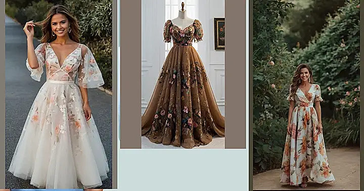 This dress is like a garden party exploded onto fabric! Imagine swirling around in a beautiful, brown-toned gown, covered in flowers that look like they were painted by a very talented artist. It’s got those cute little puff sleeves – like mini clouds of fabric – and a sweetheart neckline that’s super flattering. Who needs a bouquet when you’re already walking around in a stunning floral masterpiece? You’ll be the fairest flower in the field (or maybe just the prom).