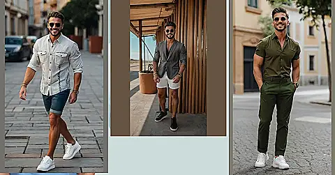 Want to look cool without looking like you tried too hard? This guy gets it. He’s rocking a casual button-up with some jean shorts and clean white sneakers. It’s like he’s saying, “Yeah, I’m stylish, but I’m also ready for a spontaneous ice cream run.” Perfect for chilling with friends, hitting up a summer concert, or just strolling around town, pretending you’re in a music video.