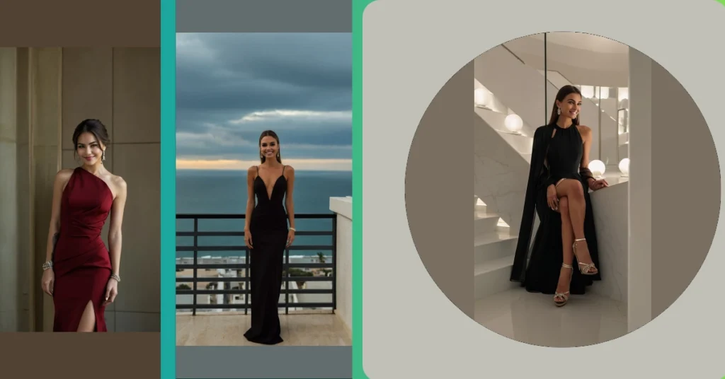 This girl is totally rocking the “elegant party dresses” look! She’s standing on a balcony overlooking the ocean, and honestly, the dress is almost as stunning as the view. It’s like a little black dress decided to go all out – long, sleek, and with a daring neckline that screams “confidence.” It’s perfect for a party, a fancy dinner, or even just casually impressing everyone at the beach (though maybe avoid getting it wet!).