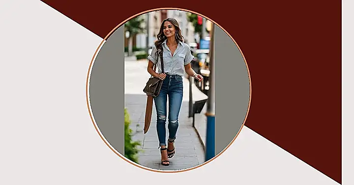 This woman is totally nailing the “middle-aged women fashion” thing, but let’s be real, “middle-aged” sounds way too grown-up! She’s looking effortlessly stylish in her light blue shirt – perfect for a warm day – and those jeans with the cool rips? They’re like, “I’m comfortable but I still got it!” The whole outfit is super casual but still totally put-together. She looks like she’s ready to grab coffee with friends or head to a fun afternoon event – and she’s doing it all while looking amazing!