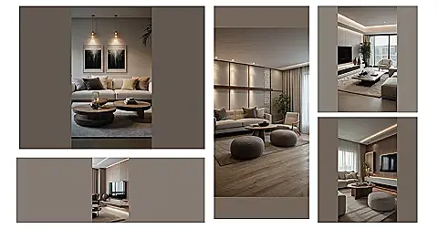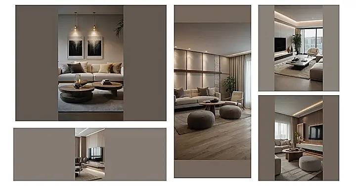 This room is seriously stylish! Look at that super-clean and modern design – it’s like stepping into a magazine spread. The neutral colours are so calming, and everything feels perfectly placed, from the cool, minimalist artwork to the comfy-looking couch, begging you to sink in with a good book. Those double-decker coffee tables are totally awesome, and you could probably hide a mountain of snacks on them if you wanted to!