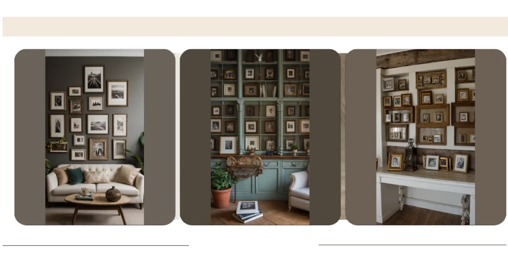 This room is like stepping into a history book! Look at all those amazing vintage frames – they’re practically shouting stories from the past. It’s like a super cool, artsy collage of old photos, and the whole thing is totally charming. Imagine all the adventures those pictures represent! It’s way more interesting than just having one big boring picture, don’t you think? It’s like a museum exhibit, but way more comfy because you can relax on that cozy-looking couch.