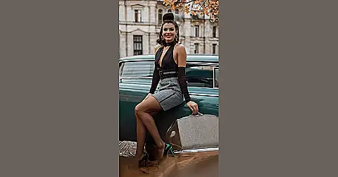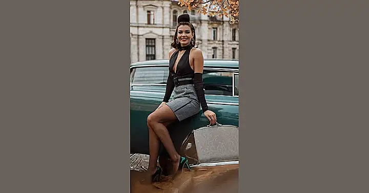 This girl is totally rocking the retro look! Imagine stepping back in time to the 1950s or 60s. She’s got the perfectly sculpted hair, a killer outfit that screams vintage glamour, and she’s even posing next to a classic car – seriously cool! That skirt and top combo? It’s the kind of outfit that would make any girl feel confident and ready to take on the world (or at least ace that history test!). Those emerald green heels? They’re the cherry on top! She looks ready for a drive-in movie or a soda fountain date – so stylish!