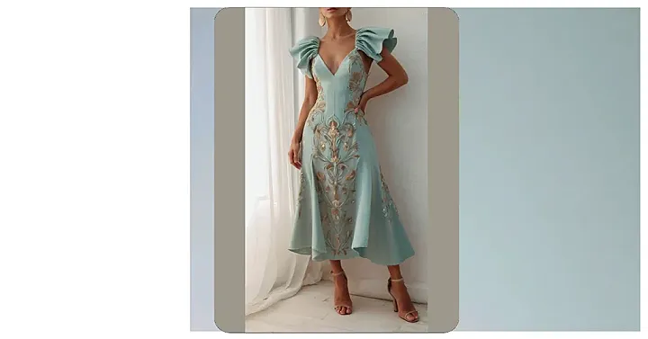 This dress is like a magical flower blooming on a summer day! It’s all flowy and pretty, perfect for twirling around in a garden, or maybe even a fancy dinner party. The colors are soft and dreamy, and the floral details make you feel like you’re walking through a field of wildflowers. It’s the kind of dress that makes you feel confident and beautiful, just like a princess in a fairytale. You could even imagine yourself as a character in one of those old-fashioned romance movies!