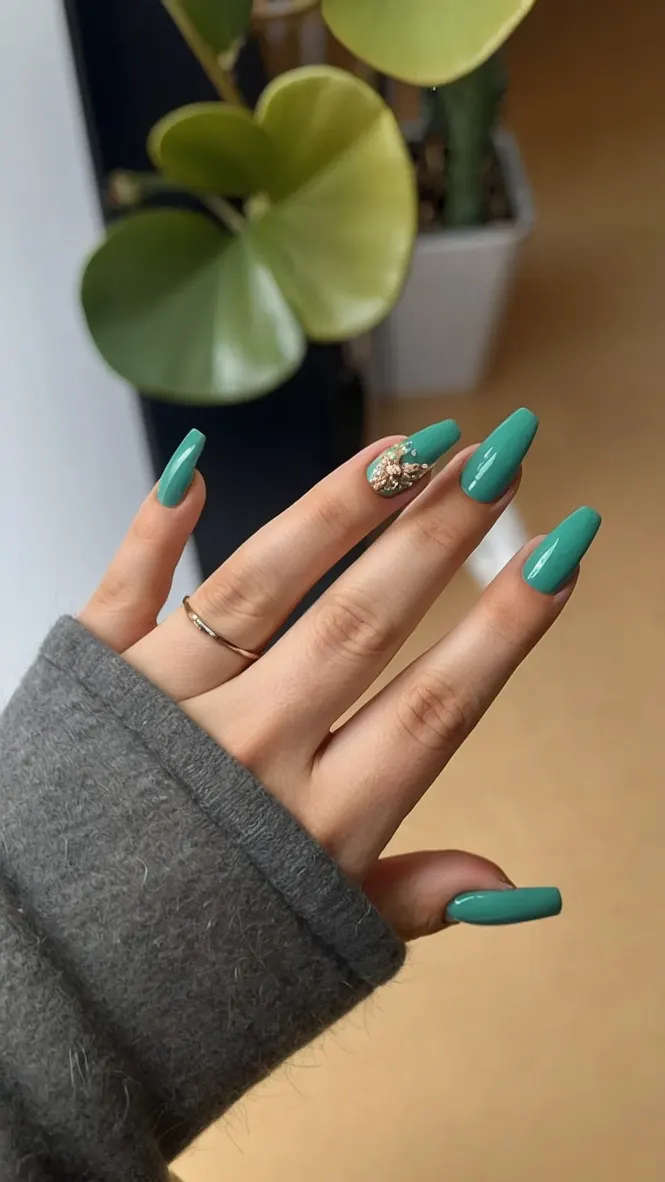 These nails are like a breath of fresh air! Just looking at them makes you want to run outside and play in the sunshine. They’re the perfect blend of natural and glam, like a forest fairy went to a fancy tea party. The green reminds you of the lush leaves of a big tree, and those sparkly bits? Those are like the tiny dewdrops glistening on a morning flower.