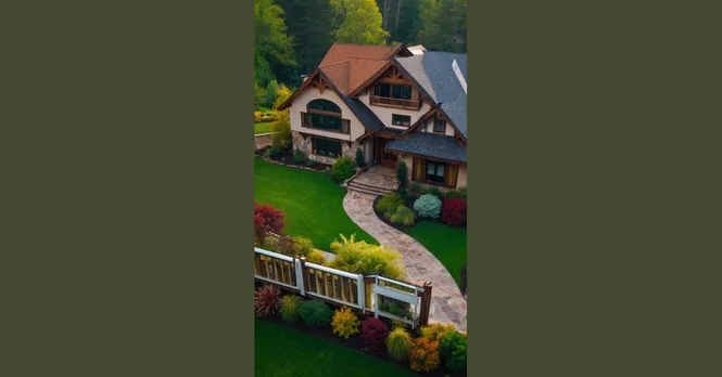This house looks like it’s straight out of a fairytale! It’s got everything you could ever want: a big, beautiful lawn that’s perfect for playing tag with your friends, a winding stone path that looks like it leads to a hidden treasure, and even a fancy-looking fence with a view of the forest. It’s kind of like the house from your favorite movie, but even better!