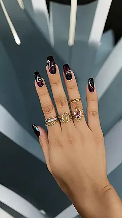 These nails are so dark and shiny, they practically glow in the winter darkness! Imagine sipping hot cocoa by a fireplace, snuggled in a blanket, and your nails perfectly matching the cozy vibes. They’re like little midnight jewels, and that sparkly accent nail? It’s like a tiny constellation on your finger—perfect for stargazing (or just staring admiringly at your awesome manicure). Even your ring looks jealous!