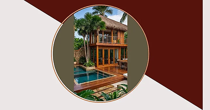 Forget about trying to build a pillow fort that collapses or cramming into a tiny tent in the backyard. Check out this place! It’s like someone sprinkled magic tropical dust on a regular house and said, “Make it awesome, and also add a pool!” This “tiny” tropical house design isn’t about roughing it; it’s about living your best life where the line between inside and outside is just… whoosh, gone! With that cool thatched roof looking like a giant straw hat and all that shiny wood, it’s basically begging you to ditch your shoes and just relax already.