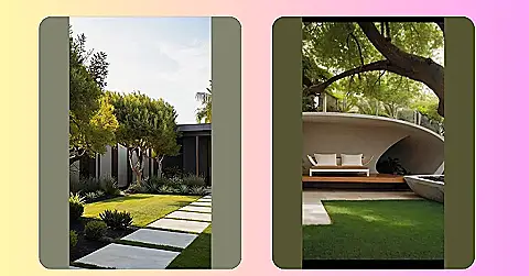 So, check out this chill zone. It’s like someone said, “I want a garden, but I also want to nap.” You’ve got a comfy couch, a little greenery that practically takes care of itself, and a big tree doing most of the work. It’s the perfect minimal garden design if you’re more into chilling than actually getting your hands dirty!
